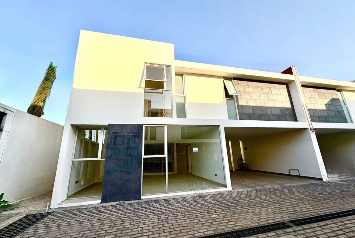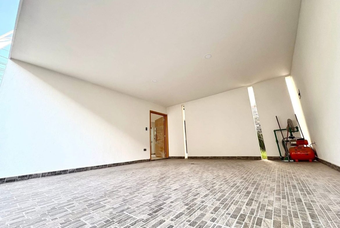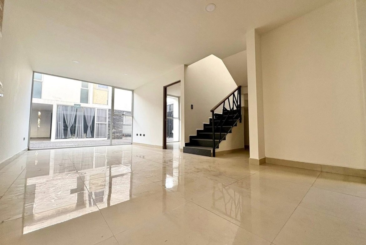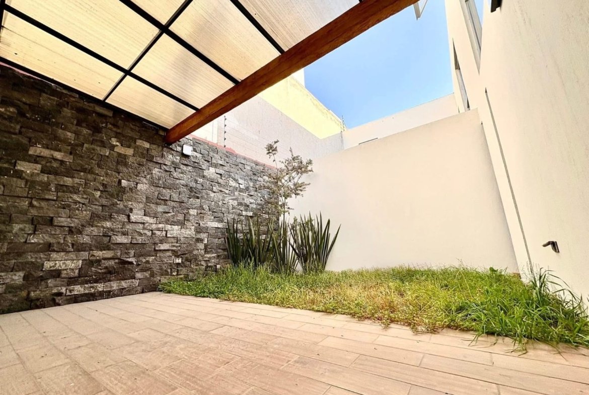 Cochera techada para 2 autos, sala, comedor, cocina equipada, estudio, oficina o pequeña RECÁMARA, terraza, jardín, medio baño de visitas.